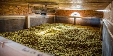 We generally harvest our hops from mid-August to mid-September. To ensure optimal aroma and brewing quality, we sample each hop variety when they appear to be ready and calculate their dry matter to determine the optimal window of time they should be harvested. With a decade of experience, we also have developed a good sense of peak texture and aroma. Each variety we grow has a different optimal harvest window. Hops that are harvested too early will not have alpha-acids sufficiently develop. Hops that are harvested too late can also lose aroma and are prone to cone breakage and storage issues.