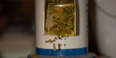 We produce our own hop pellets right here, using a PM810 hop pelletizing system from Buskirk Engineering. This machine is specialized for making hop pellets and maintains lower temperatures than many other machines on the market. Once our hops are perfectly dried and conditioned at ~9% moisture content, they are loaded into the top of the pelletizer where the hammer mill turns them into a coarse powder. This flows into the surge tank, where augers move the powder toward the pellet mill that compresses the powder into well-formed T-90 pellets. Temperatures during the pelletizing process do not exceed 120F. Finished pellets are immediately placed on mesh trays with air fanned from below to quickly cool and condition them prior to packaging.