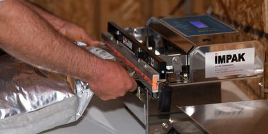 Hop pellets are weighed and packaged into Mylar bags that are then oxygen-purged, nitrogen-flushed, and sealed with an electric-motor vacuum sealer into soft packs. Our product labels show information on variety, lot number, date, weight, and alpha acids.