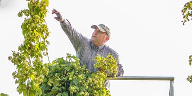 We’ve overcome many challenges related to investing in equipment and learning about producing a great quality product. Hops are expensive to invest in: trellising, rootstock, and equipment are all significant costs, and the plants do not produce fully until their third year. Finding temporary seasonal labor can be a challenge. There are always challenges to face in the hopyard, but we’ve been doing this for so long now that addressing the growing cycle has become somewhat routine. Timing is very important, whether it be stringing and training at the right time, irrigating, fertilizing, harvesting at optimal times. Downy mildew, a fungal disease, is a concern that we work to prevent each year. Sometimes an insect pest will crop up in large enough numbers to be a concern, depending on weather and other factors.